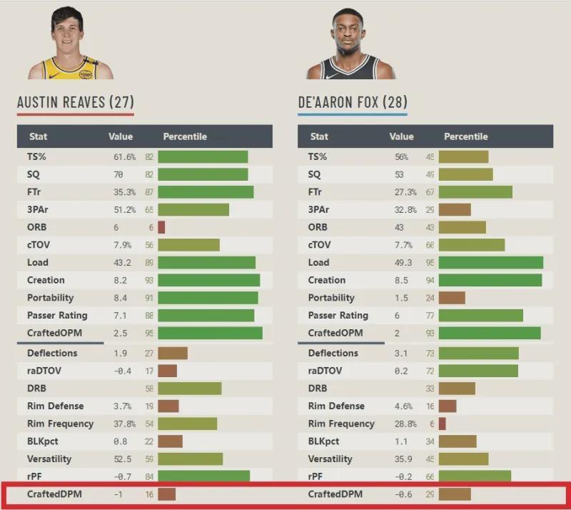 综合二人的防守数据,我以craftednba网站的高阶防守数据CraftedDPM做依据,里夫斯的CraftedDPM综合防守影响力为-1,领先全联盟16%的球员,而福克斯CraftedDPM综合防守影响力为-0.6,领先全联盟29%的球员。