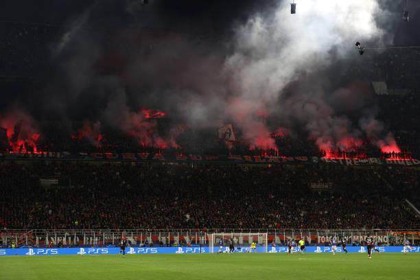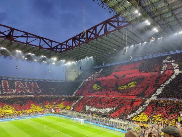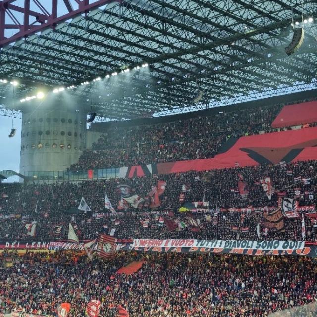 赛前半个多小时,米兰南看台已经打出这样的横幅。随着双方球员从通道走出,魔鬼的脸庞瞬间覆盖了整面看台。半决赛首回合赛前,AC米兰俱乐部号召全球粉丝用红色的灯光点亮每一间屋子,红色象征着米兰,或许也可以象征《神曲》里身穿红袍的但丁。米兰球迷们自称从地狱走出,他们的球队在1月份的连续惨败后几乎坠入地狱,在3月份的灵感枯竭时与维吉尔一同来到炼狱,又在5月份的欧冠主题曲中梦想进入天堂。然而,魔鬼终究被拦在了天堂门外,蓝黑军团施展了驱魔之术。