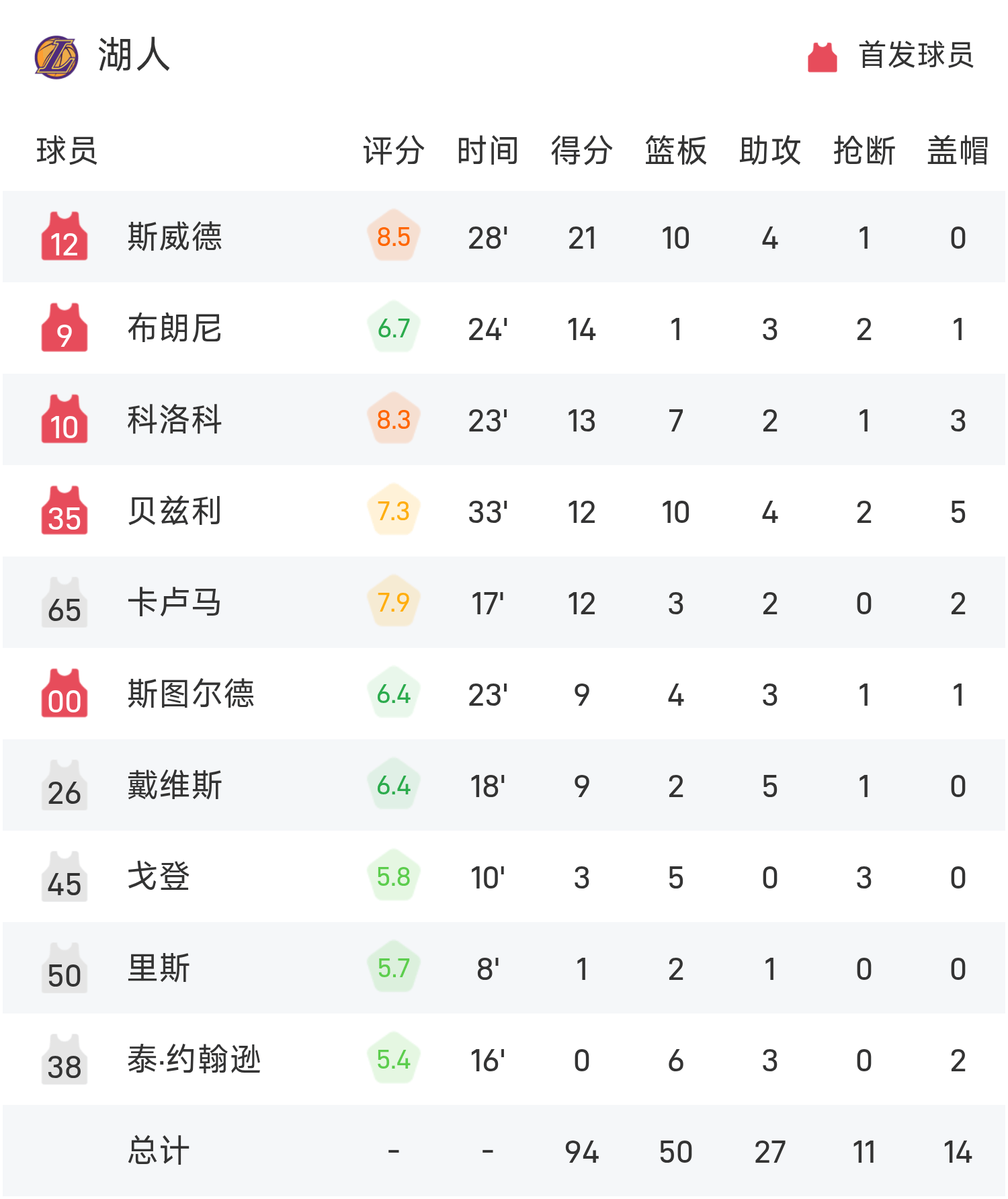 斯威德砍下全场最高的21分10板4助,广东名宿贝兹利12分10篮板4助攻5封盖,布朗尼14分,率领湖人成功取胜。